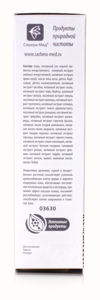 Состав: вода, нативный сок корней любистка лекарственного, нативный экстракт эмблики лекарственной, нативный экстракт ореха кукуй, масло инка инчи, дёготь берёзовый, дёготь можжевеловый, нативный экстракт паслёна, нативный экстракт осоки, нативный экстракт коры берёзы, нативный экстракт лопуха, масляный экстракт лопуха, масляный экстракт крапивы, нативный экстракт прополиса, нативный экстракт клевера, нативный экстракт гинкго двулопастного, масляный экстракт ромашки, масляный экстракт зверобоя, нативный экстракт шелковицы, нативный экстракт стручков фасоли, нативное масло плодов шиповника, нативное масло семян амаранта, нативный экстракт плодов черники, нативный экстракт горчицы, нативный экстракт чёрного тмина, нативный экстракт семян ликоподия, нативный экстракт бутонов гвоздики, нативный экстракт рейши, нативный экстракт артемии, нативный экстракт падуба, нативный экстракт лапачо, мумиё, каменное масло, мускус бобра.